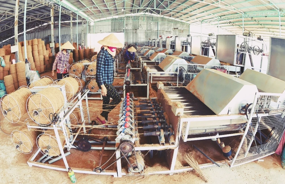 Quang cảnh sản xuất tại Công ty TNHH MTV Út Mừng, doanh nghiệp nhận hỗ trợ từ dự án để phát triển quy trình sản xuất chỉ xơ dừa và các sản phẩm thủ công từ xơ dừa. (Ảnh: H.P)