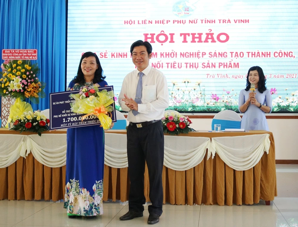 Ông Lâm Hữu Phúc – Giám đốc Dự án SME Trà Vinh trao gói tài trợ 1,7 tỷ đồng cho Quỹ tín dụng hỗ trợ Phụ nữ phát triển kinh doanh cho Hội Liên hiệp Phụ nữ tỉnh Trà Vinh. (Ảnh: H.P)