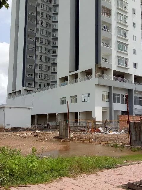 Trong chung cư, có một tốp thợ khoảng 7-8 người đang tiếp tục làm nốt những hạng mục còn dang dở. Phía trước, một tòa nhà dùng làm căn hộ mẫu dường như đã bị bỏ hoang từ lâu, cửa đóng im ỉm với nhiều vật dụng đã bị rỉ sét cả bên trong lẫn bên ngoài.