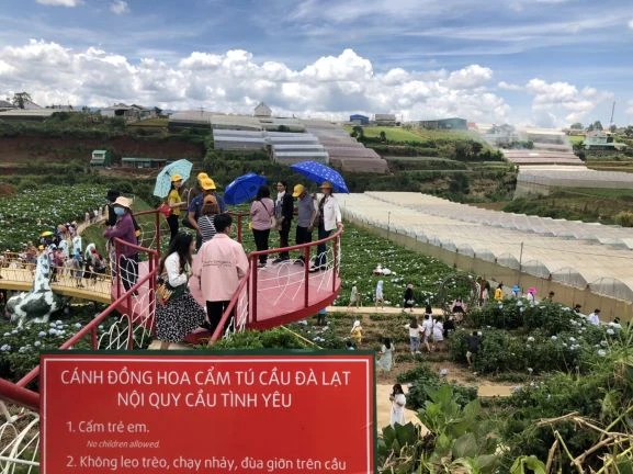 Khách du lịch tại Cánh đồng hoa Cẩm Tú Cầu Đà Lạt . Ảnh: TÚ UYÊN