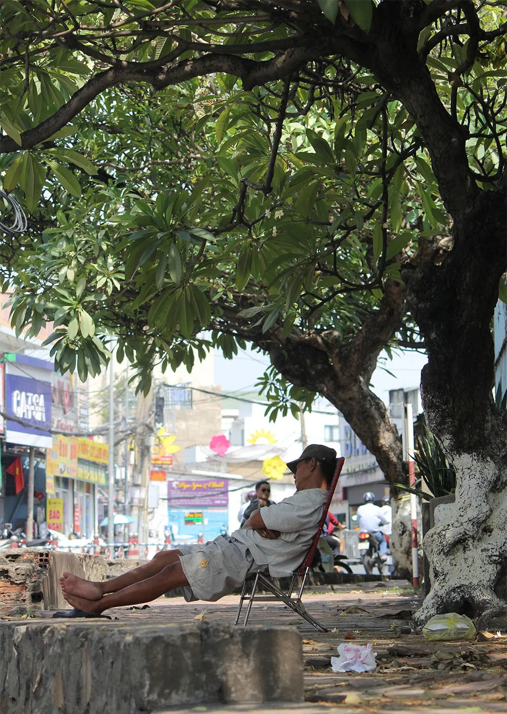 Người đàn ông bắc ghế ngủ dưới gốc cây buổi trưa.