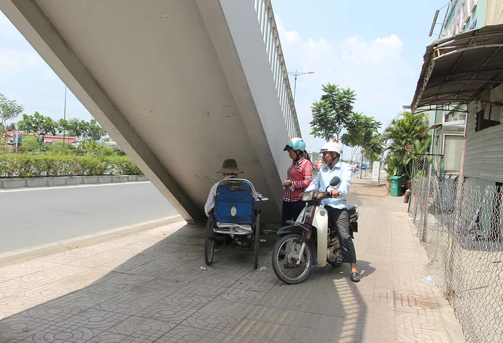 Người bán vé số tránh nắng dưới chân cầu bộ hành trên đường Phạm Văn Đồng.