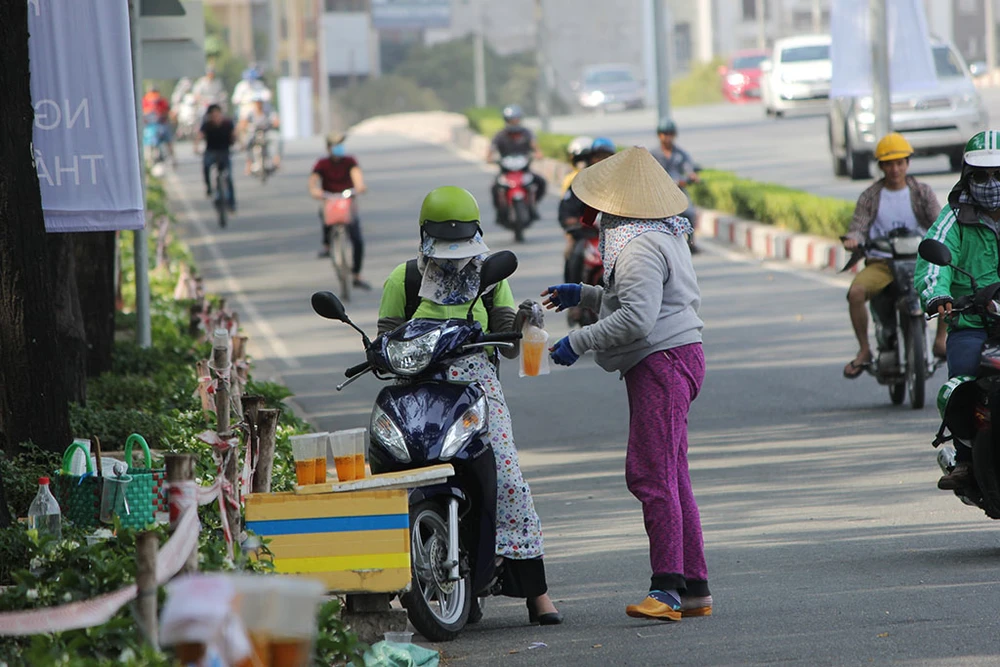 Ngoài bịt kín từ đầu đến chân, người dân còn tranh thủ bù đắp nước trong ngày nắng nóng.