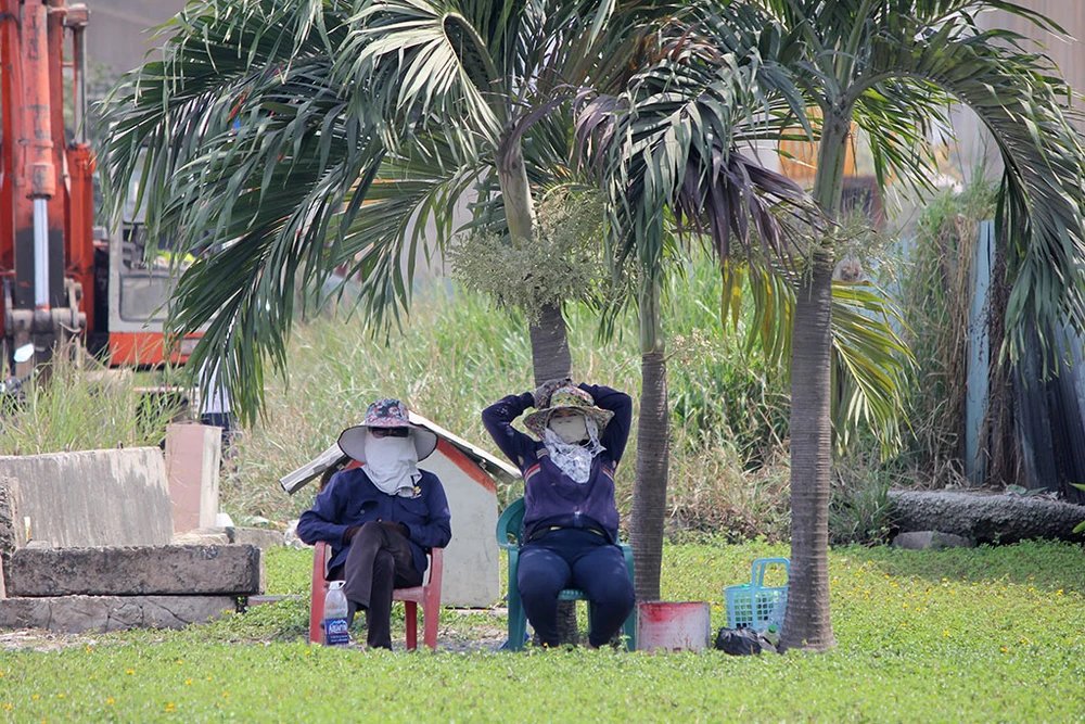 Hai người phụ nữ bịt kín mặt mũi ngồi tránh nắng dưới bụi cây giữa trưa.