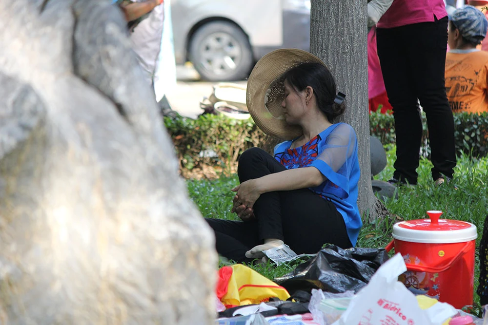 Người phụ nữ tranh thủ chợp mắt dưới gốc cây xanh trong công viên.