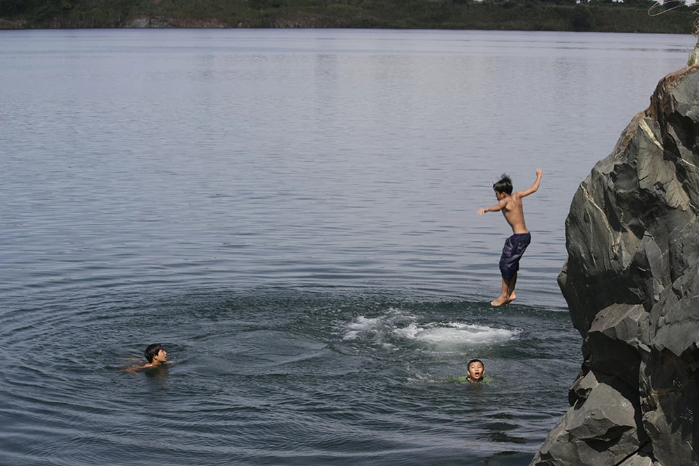 Những đứa trẻ chọn cách tắm ở hồ đá (quận Thủ Đức) để giải nhiệt giữa trưa.
