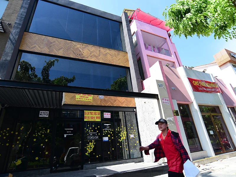 Hàng loạt mặt bằng ở đường Phan Xích Long (quận Phú Nhuận, TP.HCM) dán thông báo cho thuê hoặc bán vì ảnh hưởng của dịch COVID-19. Ảnh: HOÀNG GIANG