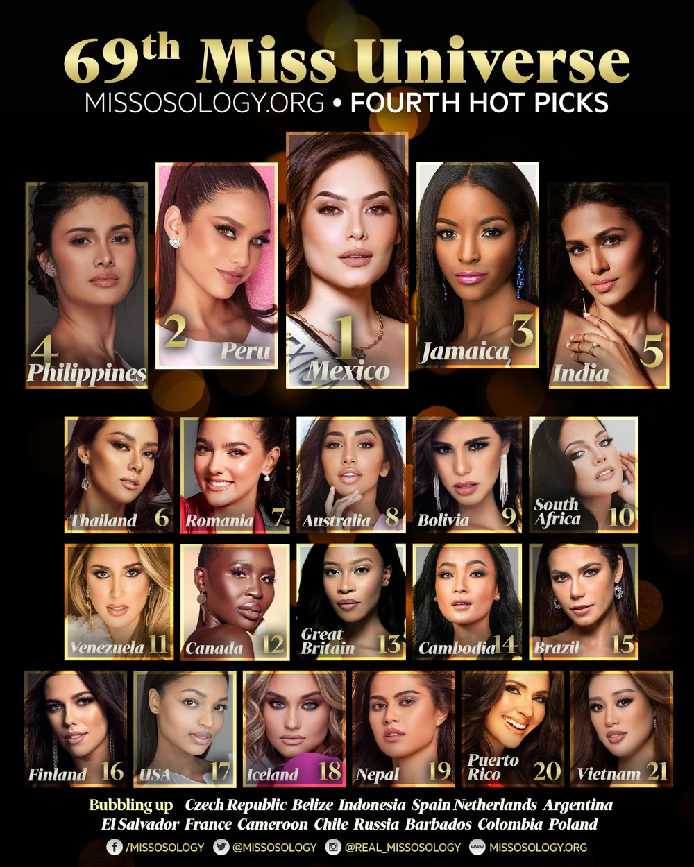 Theo chuyên trang này, 5 gương mặt tạm thời được đánh giá cao nhất là đại diện của Mexico, Peru, Jamaica, Philippines và Ấn Độ.