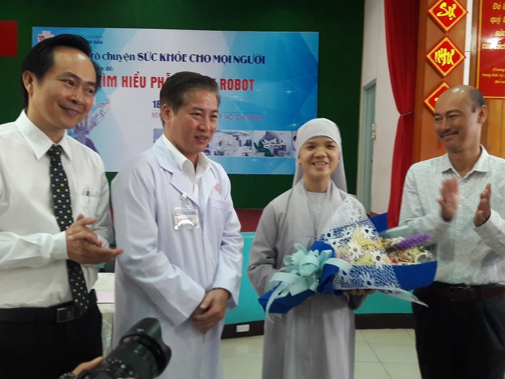 Ban giám đốc BV tri ân bệnh nhân đã tin tưởng BV Bình Dân thực hiện phẫu thuật bằng robot hiện đại. Ảnh: HÀ PHƯỢNG