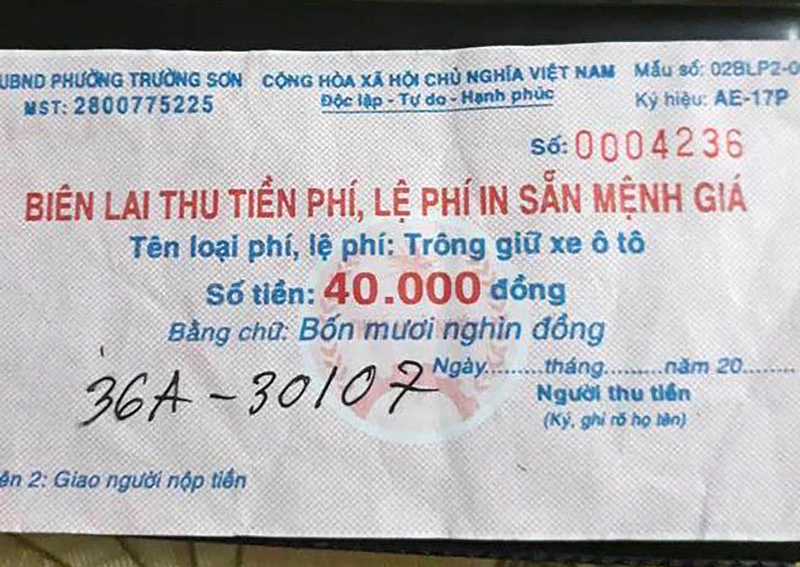 Theo ông Nam, trước đó ông có ký hợp đồng có trị 180 triệu đồng trong khoảng thời gian bốn tháng để thầu bãi giữ xe với UBND phường Trường Sơn từ ngày 10-5-2018. “Tuy nhiên, chỉ sau đó một ngày (tức là ngày 11-5), chúng tôi phải lên UBND phường nhận 10 cuốn biên lai trông giữ xe mệnh giá loại 40.000 đồng và ký vào sổ biên nhận của kế toán. Bản thân chúng tôi chỉ thu theo biên lai in sẵn của phường” - ông Nam thông tin.