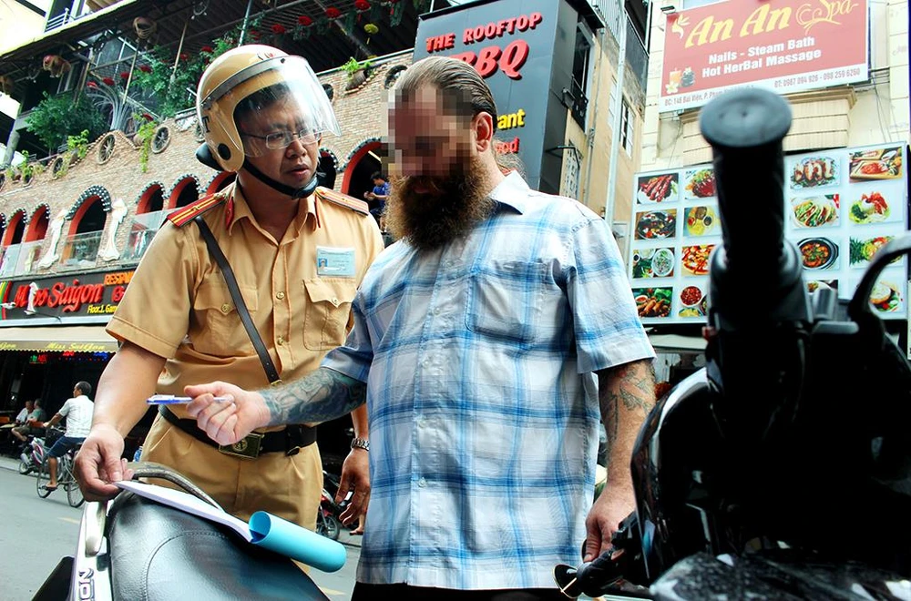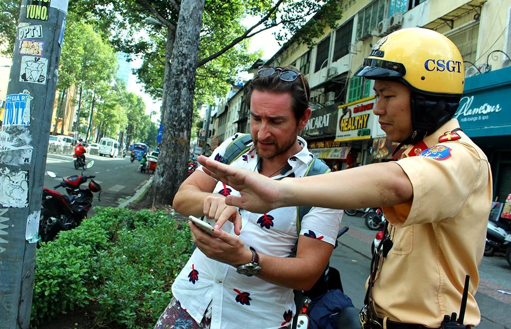 Chiều 16-8, tổ công tác chuyên đề thực hiện tuyên truyền và xử lý hành vi vi phạm về trật tự an toàn giao thông đối với người nước ngoài của Phòng CSGT (PC08, Công an TP.HCM) đã đi tuần tra trên rất nhiều tuyến đường quanh quận 1.