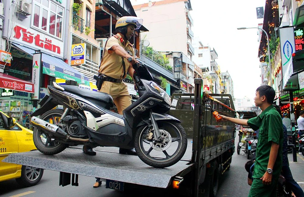 Sau khi người vi phạm bỏ đi, CSGT buộc phải đưa xe về trụ sở. Ảnh: LÊ THOA