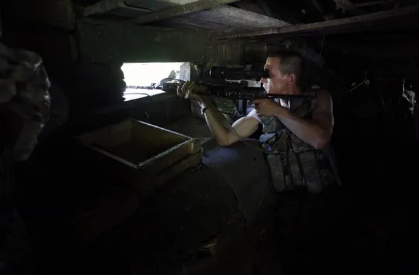 Một lính bắn tỉa Ukraine ngắm bắn tại vị trí do lực lượng Ukraine kiểm soát đã bị bắt giữ ở làng Pisky vùng Donetsk hôm 25-7 (Ảnh: AFP)