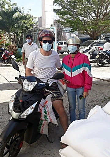 Du khách này là một người đàn ông, tự chở trên xe máy sáu bao gạo, mỗi bao 50 kg. Ông cho biết rất xúc động khi chứng kiến những người nghèo, có hoàn cảnh khó khăn tại Mũi Né được nhận gạo miễn phí hằng ngày. Do đó ông muốn góp 300 kg gạo để ủng hộ.