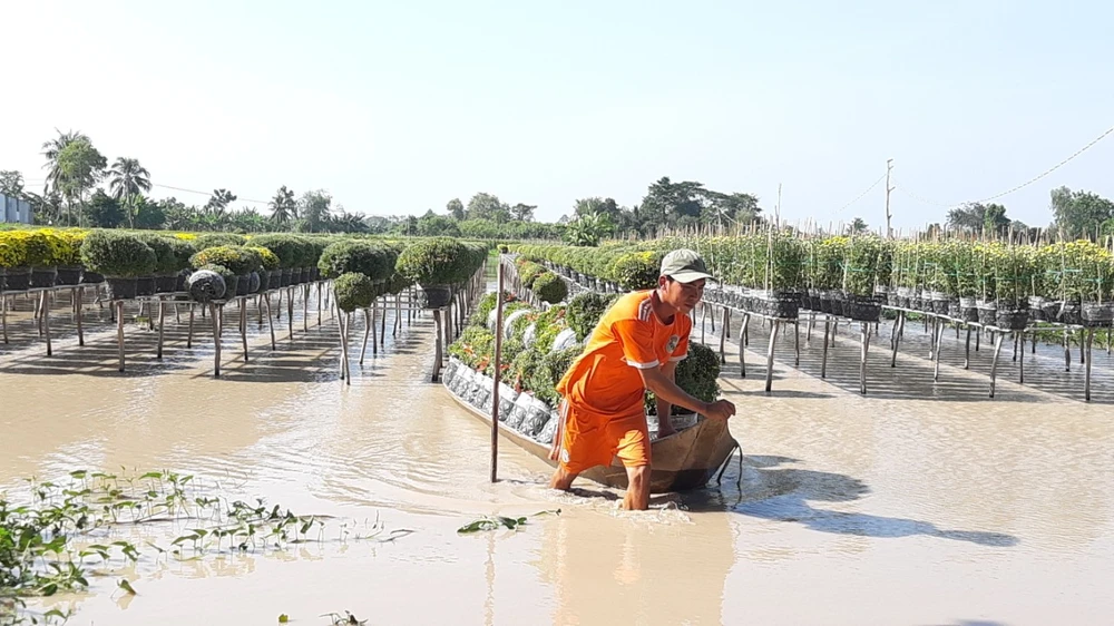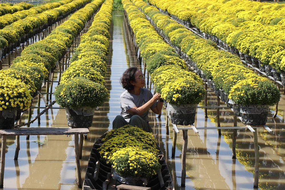 Một điều thú vị tại đây là hoa được đặt trên giàn cao, phía dưới là nước sâu hơn bắp chân phục vụ cho việc tưới tiêu.