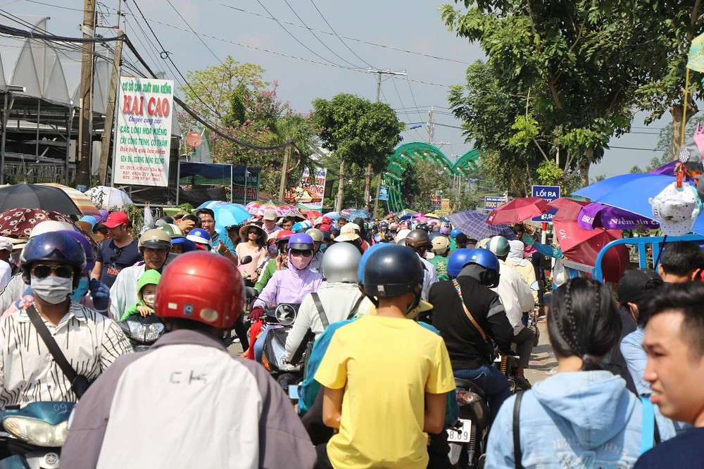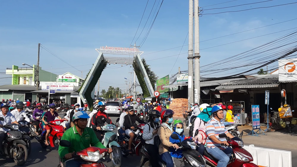 Sáng sớm 20-1 (15-12 âm lịch) tuyến đường dẫn vào làng hoa đông nghẹt, nhất là khu vực đường hoa Sa Nhiên – Cai Dao.