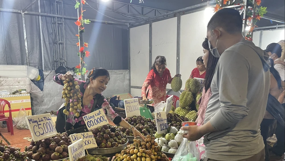 Chủ một gian hàng trái cây cho biết, măng cụt ở đây được hái từ vườn rồi mang thẳng ra đây, trái nào cũng to, ngọt. Lượng khách đến mua trái cây về ăn, làm quà cho người thân bạn bè rất nhiều.