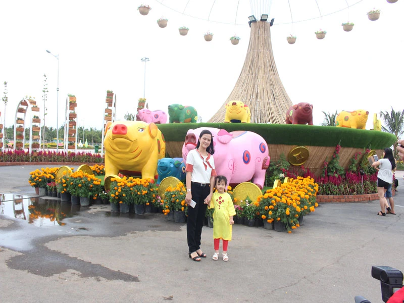Nổi bật nhất đường hoa là hình ảnh "những chú heo khổng lồ" tượng trưng cho linh vật của năm Kỷ Hợi được trang trí ngộ nghĩnh, đẹp mắt, nằm ngay cổng chính đường hoa.