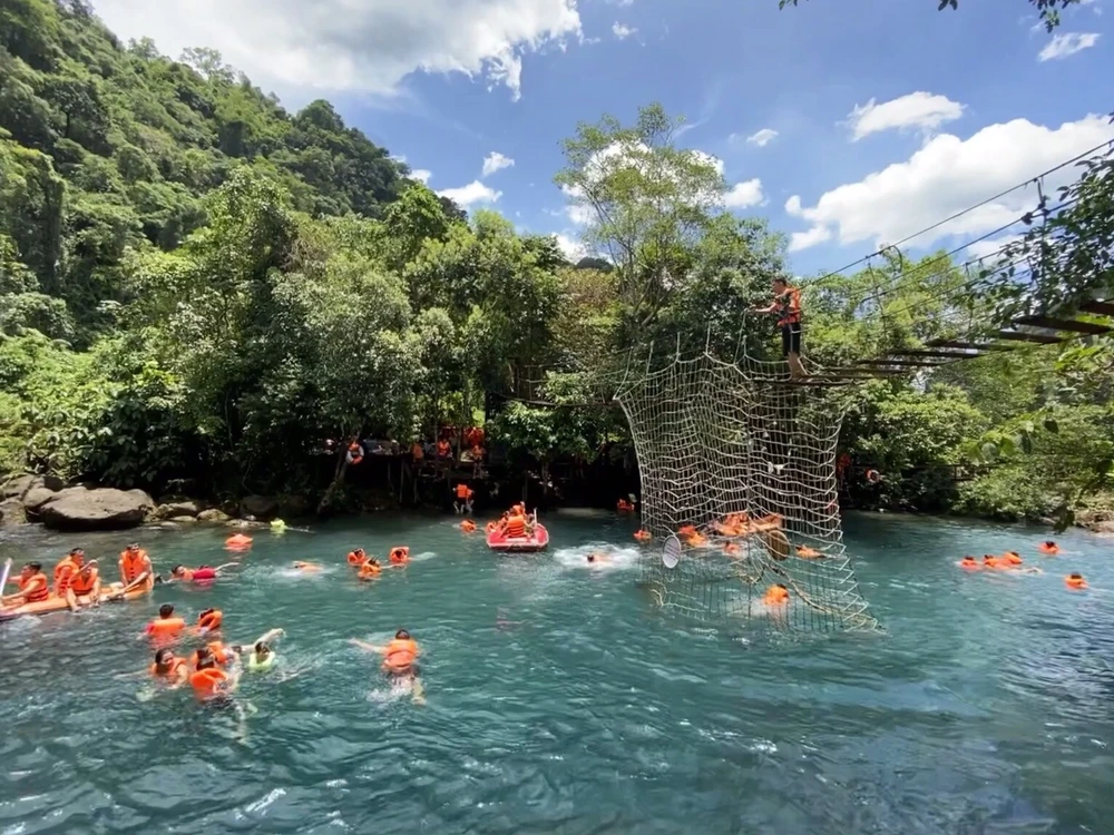 Khách đến Quảng Bình trải nghiệm các dịch vụ vui chơi dưới nước tại suối Nước Moọc. Ảnh MT
