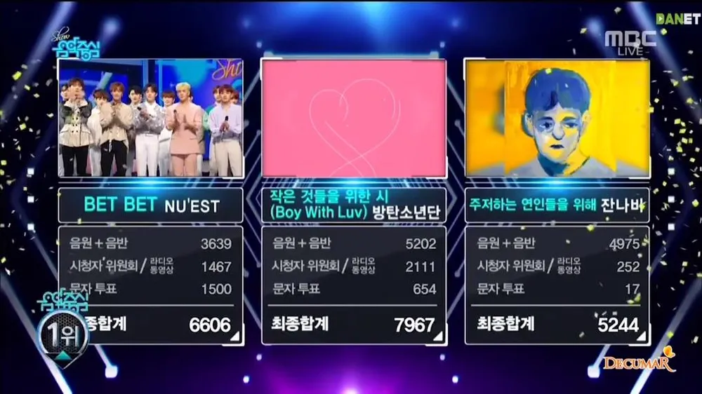 Dù đã ngừng hoạt động quảng bá tại các show âm nhạc nhưng Boy With Luv của các chàng trai vàng BTS lại vừa đạt chiến thắng thứ 9 chung cho ca khúc trên tất cả các mặt trận và chiến thắng thứ ba chỉ trong bảng xếp hạng âm nhạc Music Core hôm nay. Ca khúc Boy With Luv đạt được lượt bình chọn cao nhất với 7.967 điểm. JANNABI về vị trí thứ 3 với 5.244 điểm, và Bet Bet của các chàng trai NU’EST về nhì với 6.606 điểm.
