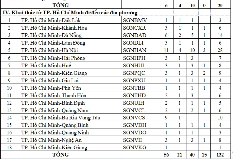 Trong đó, TP.HCM khôi phục lại 18 đường bay với 132 chuyến bay khứ hồi/ngày, Đà Nẵng có 43 chuyến khứ hồi trên 10 đường bay, Lâm Đồng 23 chuyến, Hải Phòng 20 chuyến, Thanh Hóa 11 chuyến, Cần Thơ 11 chuyến, Nghệ An 19 chuyến, Đắk Lắk 14 chuyến, Khánh Hòa 20 chuyến, Điện Biên 2 chuyến.