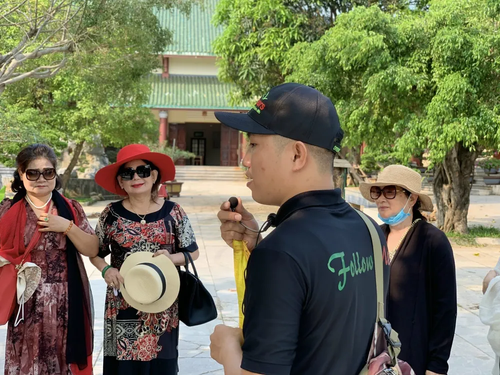 Hướng dẫn viên đang hướng dẫn cho du khách quốc tế tại một điểm tham quan tại TP Đà Nẵng trước khi dịch diễn ra. Ảnh: TÂM AN.