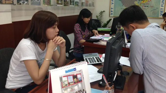Sau khi chúng tôi đăng ký mua tour, một nữ nhân viên đã gọi điện thoại cho ai đó để hỏi chỗ rồi thông báo cho chúng tôi lịch trình và giá tour.