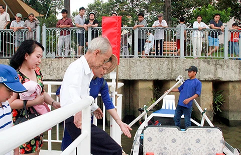 Những du khách đầu tiên đi tour du lịch trên kênh Nhiêu Lộc - Thị Nghè. Ảnh: NGUYỄN TÂN