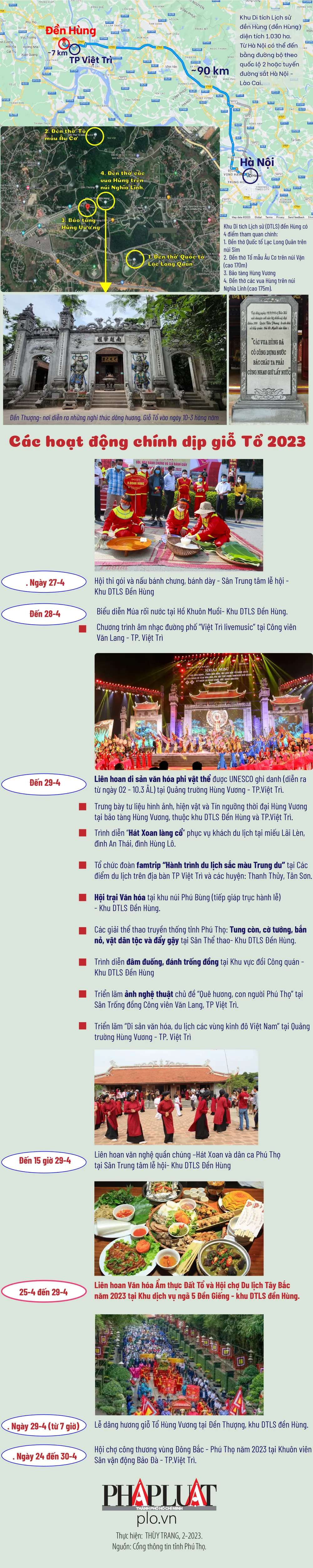 (PLO)- Ngoài Lễ dâng hương giỗ Tổ Hùng Vương 2023 được tổ chức vào lúc 7 giờ sáng 29-4 (mùng 10-3 âm lịch) tại Đền Thượng, những hoạt động đáng chú ý khác là Liên hoan Văn hóa Ẩm thực Đất Tổ và Hội chợ Du lịch Tây Bắc năm 2023 tại Khu dịch vụ ngã 5 Đền Giếng - khu Di tích Lịch sử đền Hùng.