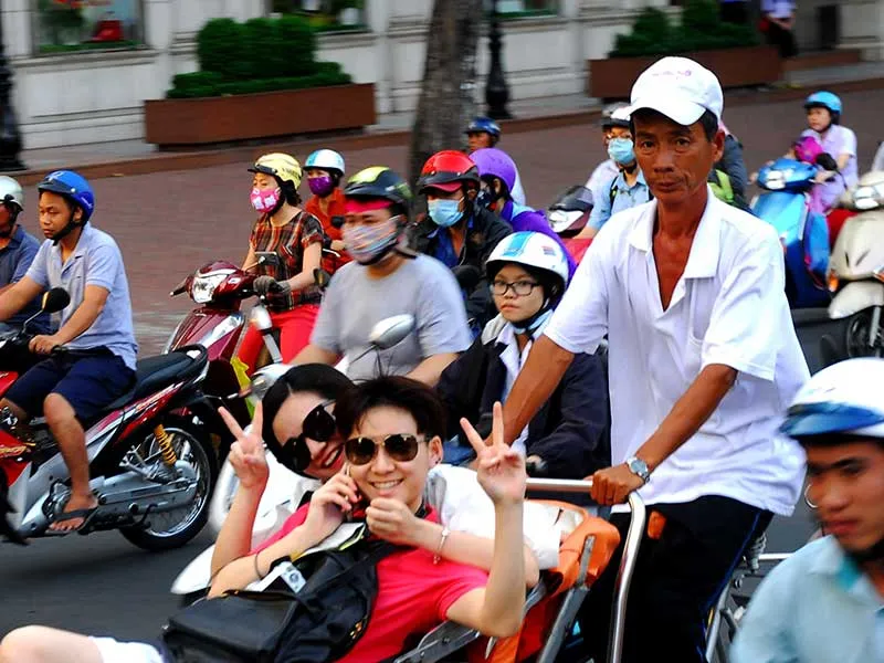 Du khách nước ngoài thích thú trên đường phố TP.HCM. Ảnh: HTD