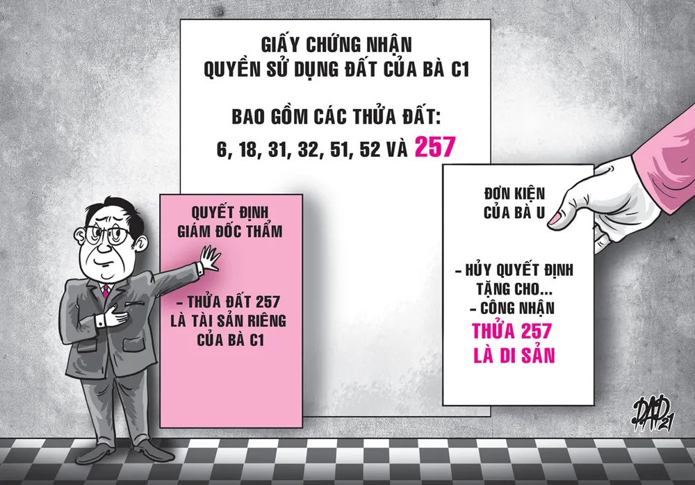 Ngày 9-5-2019, TAND thị xã Tân Uyên (Bình Dương) tuyên chấp nhận yêu cầu chia di sản của bà C1 là quyền sử dụng diện tích đất thuộc thửa số 257. Bà U. và các đồng thừa kế được hưởng di sản thừa kế là QSDĐ với diện tích đất 344,1 m2.