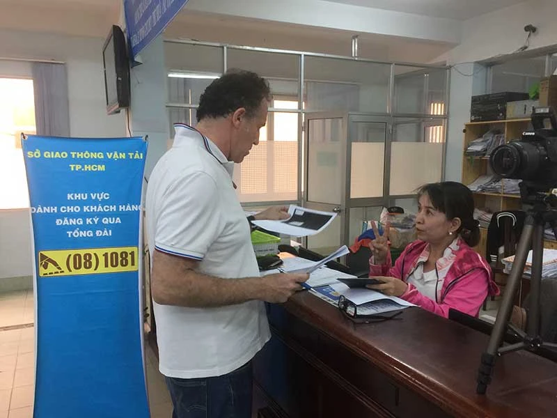 Thủ tục và tiện ích cấp đổi bằng lái qua tổng đài 1081 đã “lan tỏa” sang cả việc đổi bằng lái quốc tế. Nhiều người nước ngoài đã sử dụng đặt, lấy số thứ tự qua 1081 để đổi bằng lái quốc tế tại Sở GTVT. Ảnh: LƯU ĐỨC