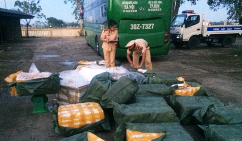 Theo Công an tỉnh Thanh Hóa cho biết, tại km số 309 thuộc địa phận xã Triệu Lộc (Hậu Lộc, Thanh Hóa) tổ tuần tra kiểm soát của Trạm cảnh sát giao thông Quảng Xương do thiếu tá Nguyễn Hữu Nam làm tổ trưởng đã phát hiện, bắt giữ xe ô tô khách BKS 30Z - 7327 đang vận chuyển 9,9 tạ nầm và đuôi gân lợn đi tiêu thụ.