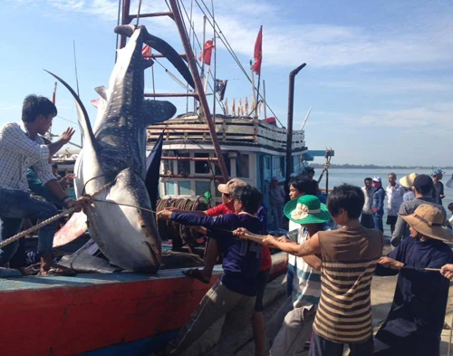 Ngư dân địa phương cùng với ngư dân Quảng Ngãi đưa cá ra khỏi tàu