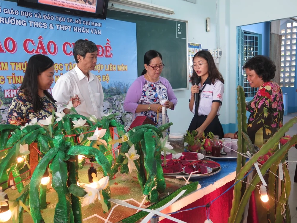 Hay nhóm của em Mỹ Linh (lớp 11/1) đã thuyết trình và tái hiện mô hình vườn thanh long Hàm Thuận Nam (Bình Thuận) nhằm giúp mọi người hiểu hết quá trình trồng, chăm sóc dựa vào ứng dụng đặc điểm sinh học để nâng cao năng suất thanh long. Đồng thời, các em tìm thêm hướng ra cho loại trái cây này để hạn chế tình trạng được mùa mất giá hay ngược lại, như làm kem...
