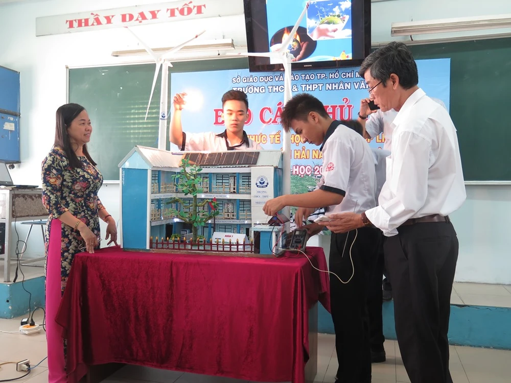 Như nhóm của em Nguyễn Văn Phú (lớp 11/2) đã thuyết trình về đề tài năng lượng tái tạo và mô hình của nhóm chính là ngôi trường THCS-THPT Nhân Văn được lắp hệ thống sử dụng năng lượng điện gió. Phú cho hay nhóm chọn đề tài này vì khi đi tham quan một số công trình về nhà máy điện thấy rất ý nghĩa vì tận dụng được các nguồn năng lượng tự như gió, mặt trời, thủy triều... để tạo ra điện năng. Sau đó, nhóm đã tận dụng các thùng giấy caton, miếng gỗ... làm nên mô hình của chính trường mình sử dụng điện gió để tạo ra điện cho trường.