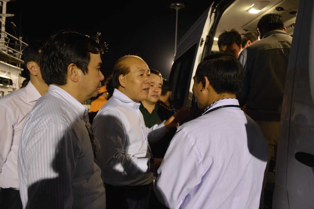 Thứ trưởng Nguyễn Văn Công chờ tàu chở thuyền viên về bờ tại cảng Vũng Tàu lúc 21 giờ 28-3. Ảnh: T