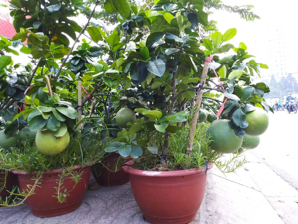 Không chỉ những chậu dưa hấu độc, lạ, các chậu bưởi dáng bon sai cũng được người tiêu dùng săn đón bởi những chùm quả xanh mướt, tượng trưng cho sự đủ đầy ngày xuân.
