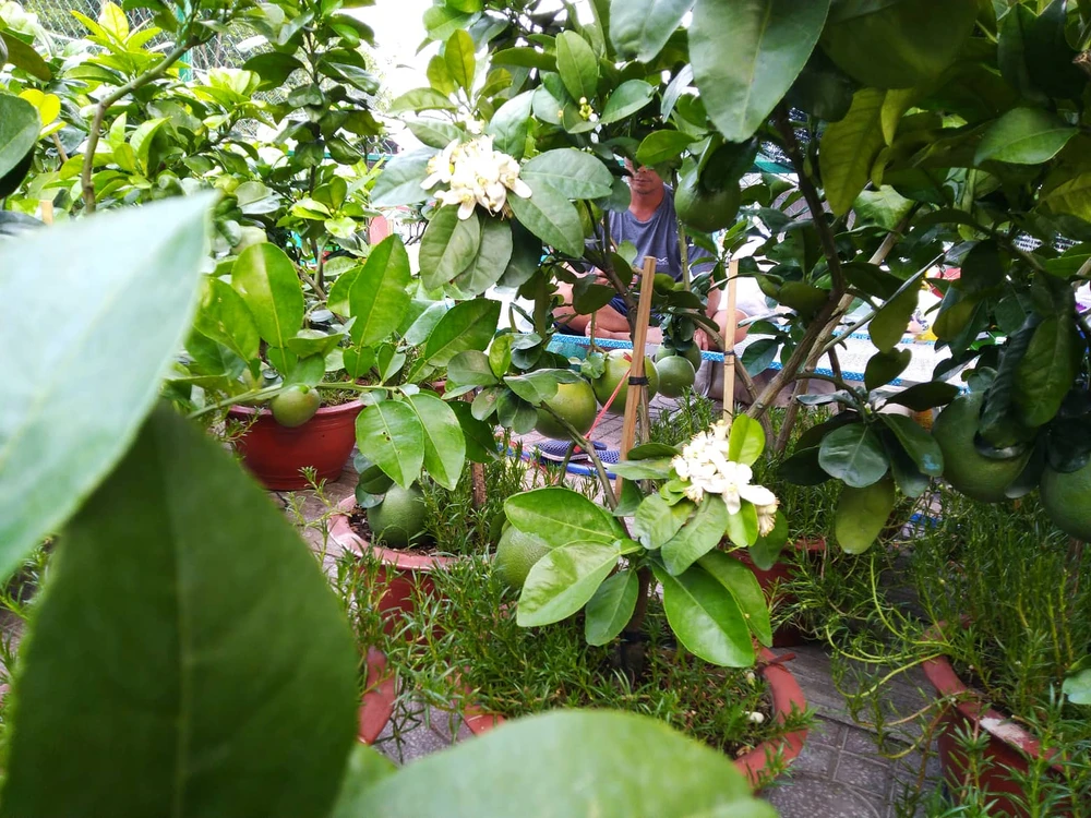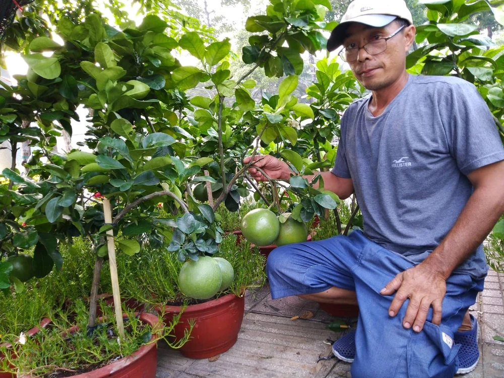 "Đây là giống bưởi da xanh ruột đỏ. Để tạo ra những chậu bưởi như thế này, tôi đã chiết cành của cây chính rồi trồng ra chậu, chăm sóc cho cây ra hoa đậu quả, sau đó vận chuyển từ Chợ Lách- Bến Tre lên đây để bán", chú Vinh vui vẻ nói.