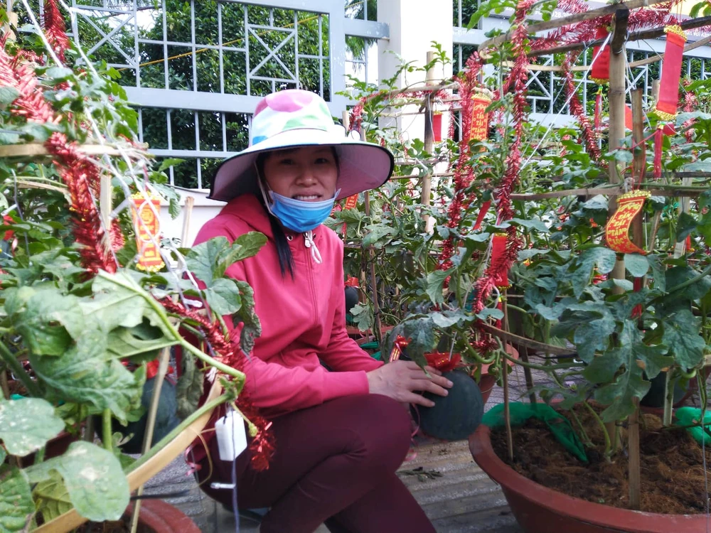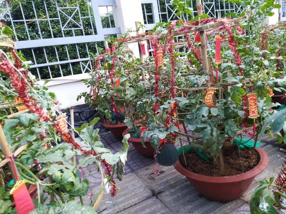 Trên những chậu cây những quả dưa hấu non đang lớn lên từng ngày.