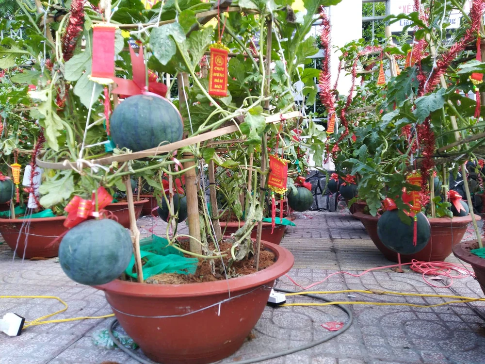 Những chậu dưa hấu này được nông dân ở Bà Rịa- Vung Tàu trồng. Ban đêm, cây được cuốn thêm đèn nhấp nháy để tăng phần cuốn hút cho sản phẩm.