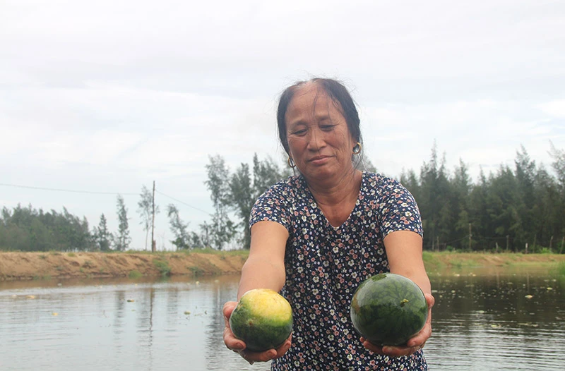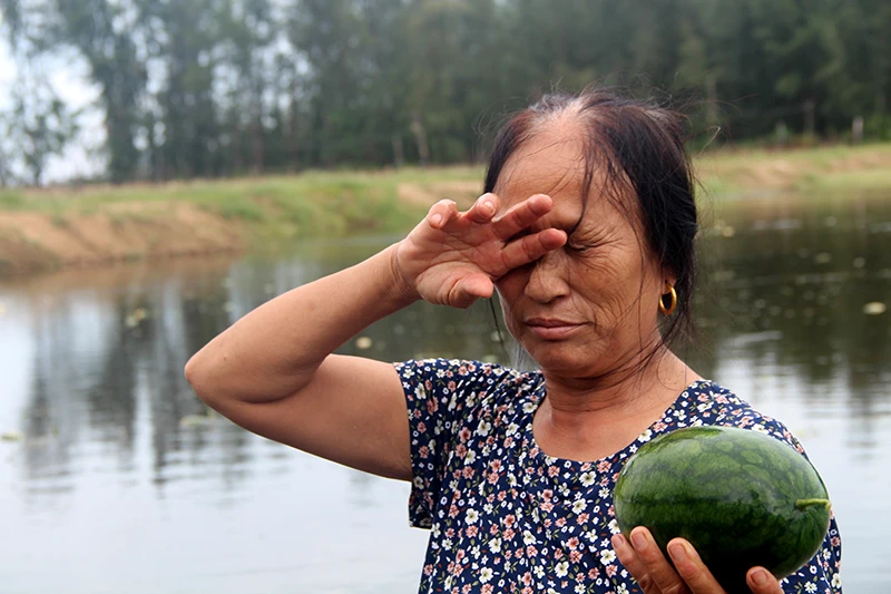 Nhưng có điều trong làn da đen sạm vì nắng gió biển, bởi những ngày vất vả vẫn còn đó và nỗi buồn đã khiến đôi mắt của người phụ nữ Lê Thị Minh (65 tuổi) ở thôn Thanh, Quảng Nham (Quảng Xương, Thanh Hóa) trĩu xuống vì những đêm thức trắng, rồi đến mất trắng mùa dưa hấu.