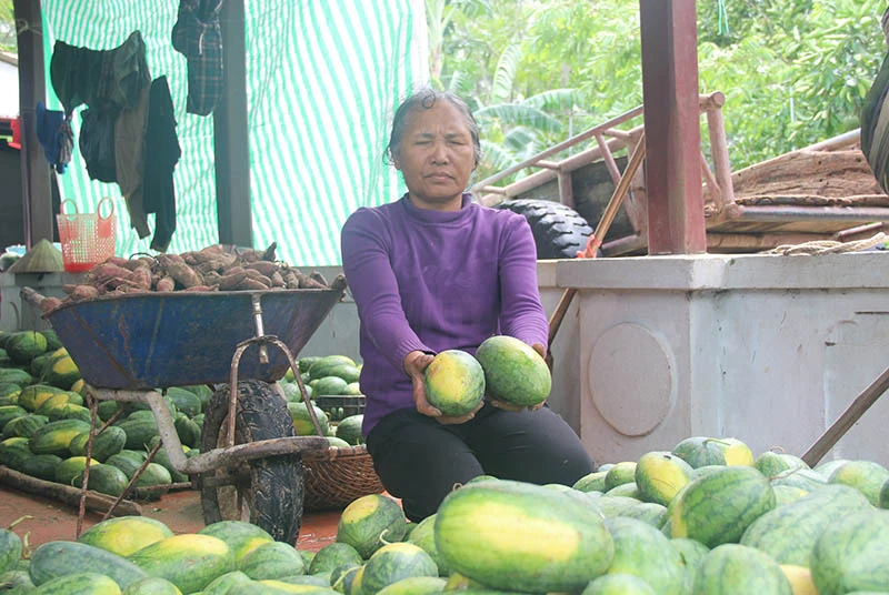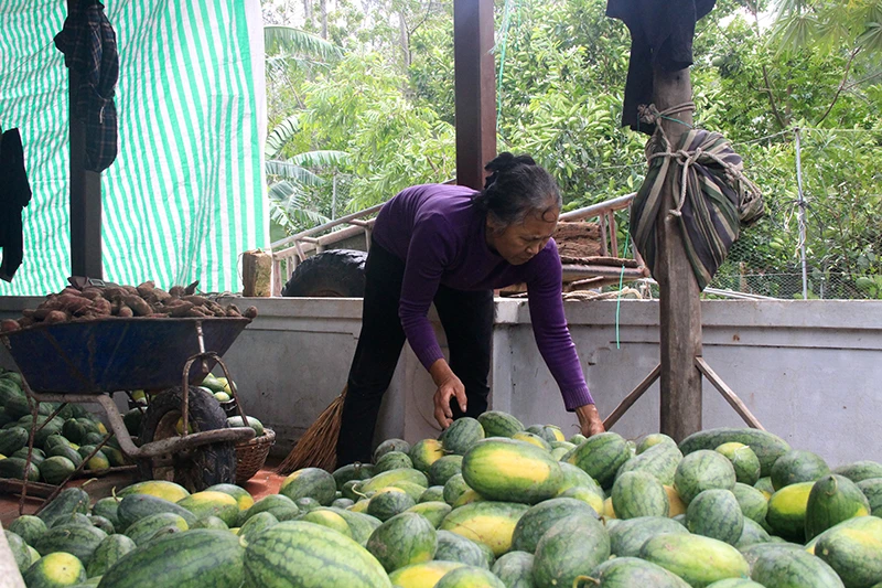 Cả tấn dưa hấu dù đã được thu hoạch nhưng gia đình bà Lê Thị Minh ở thôn Thanh, Quảng Nham không biết bán cho ai. Ảnh: Đ.TRUNG