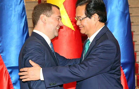 Thủ tướng Nguyễn Tấn Dũng và Thủ tướng Dmitry Medvedev sau khi kết thúc hội đàm. Ảnh: ttxvn