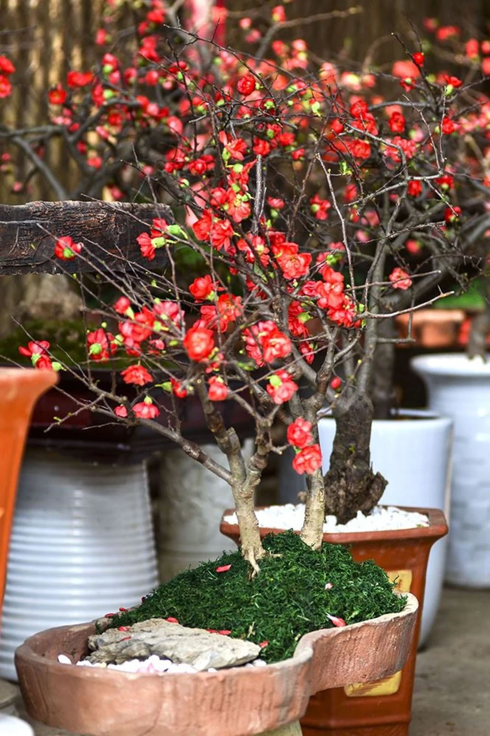 Một loại mai độc đáo khác được nhiều cửa hàng lấy hàng từ các tỉnh miền Bắc đưa vào TP.HCM là cây mai đỏ bonsai. Chị Lan Anh, chủ cửa hàng hoa trên đường Cách Mạng Tháng Tám cho biết đây là loại cây cảnh có xuất xứ ở Trung Quốc. Hoa có màu đỏ rất lạ giống hoa đào. Cây mai đỏ nổi bật nhờ gốc nhìn giống cây cảnh bonsai, xù xì có giá từ 1-5 triệu đồng/chậu.