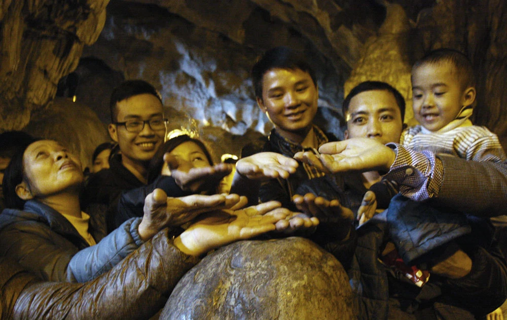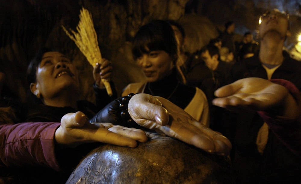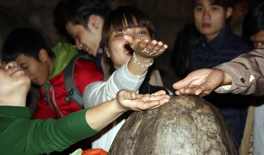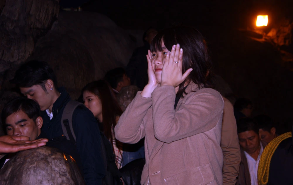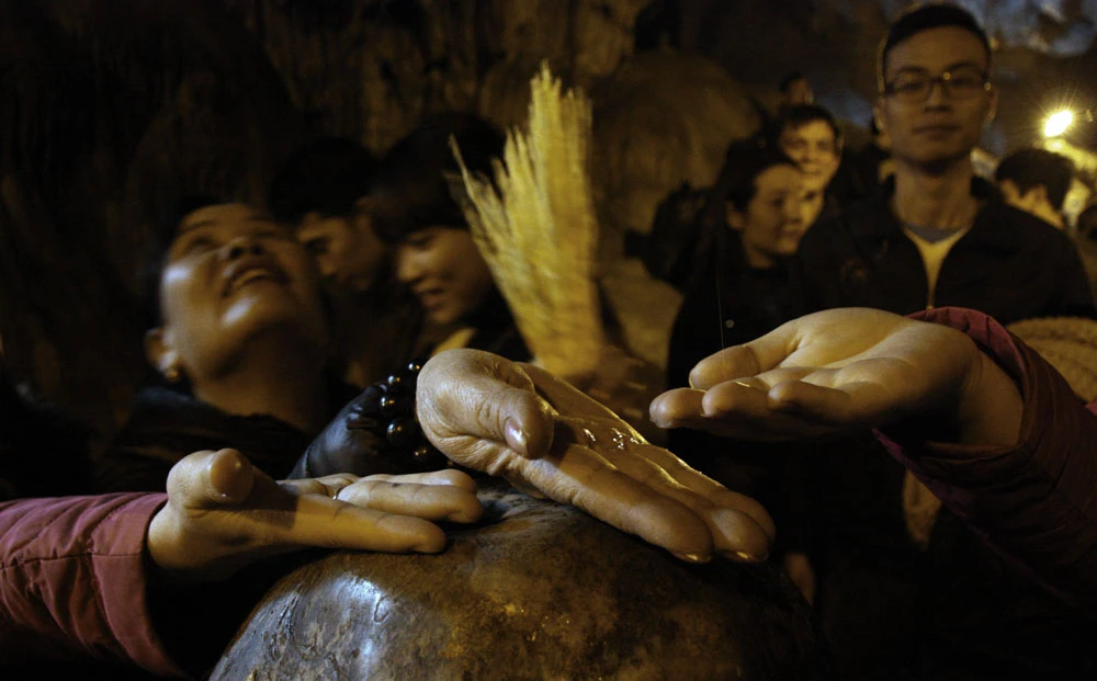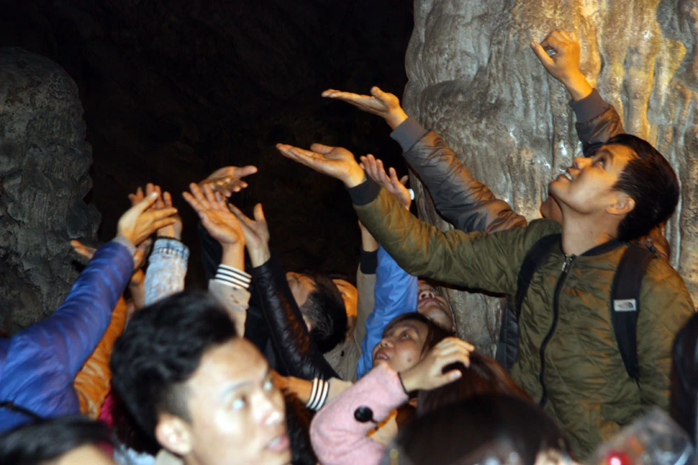 Sau khi thắp hương khấn phật xong, nhiều người đua nhau đưa ra tay hứng những giọt nước từ thạch nhũ trên cao rơi xuống.