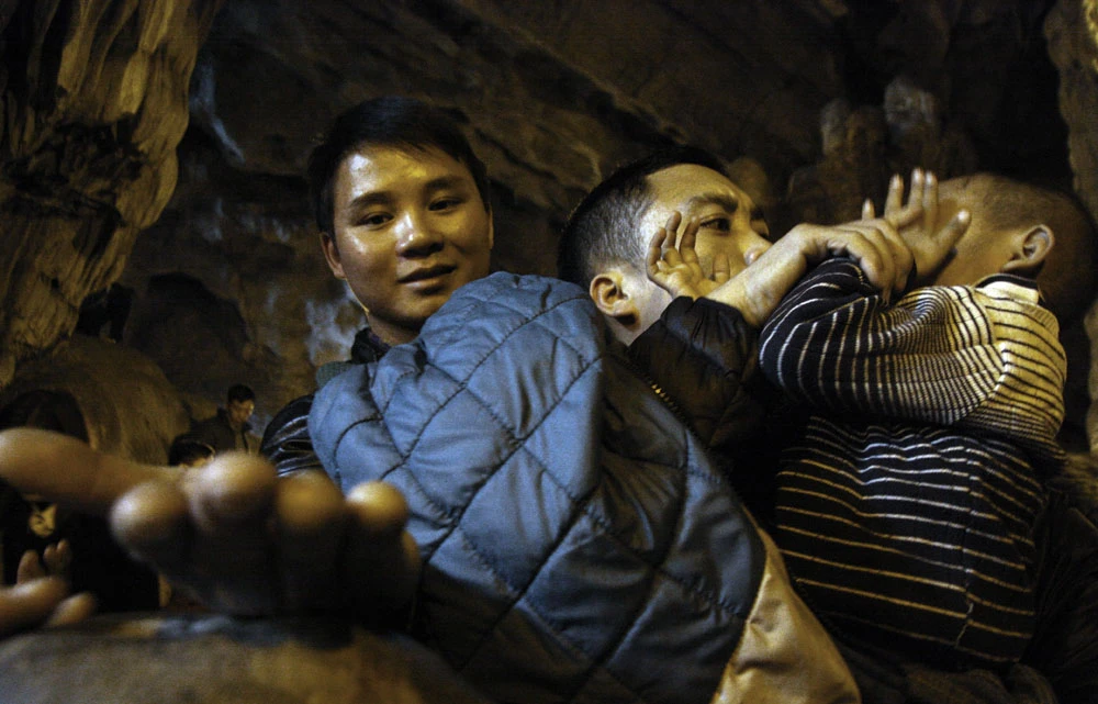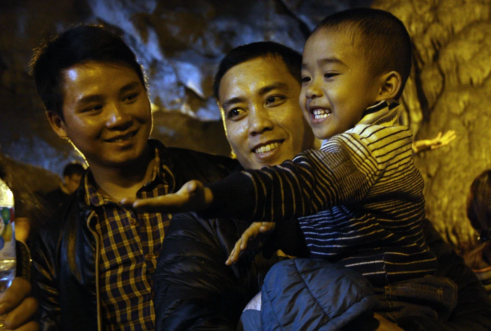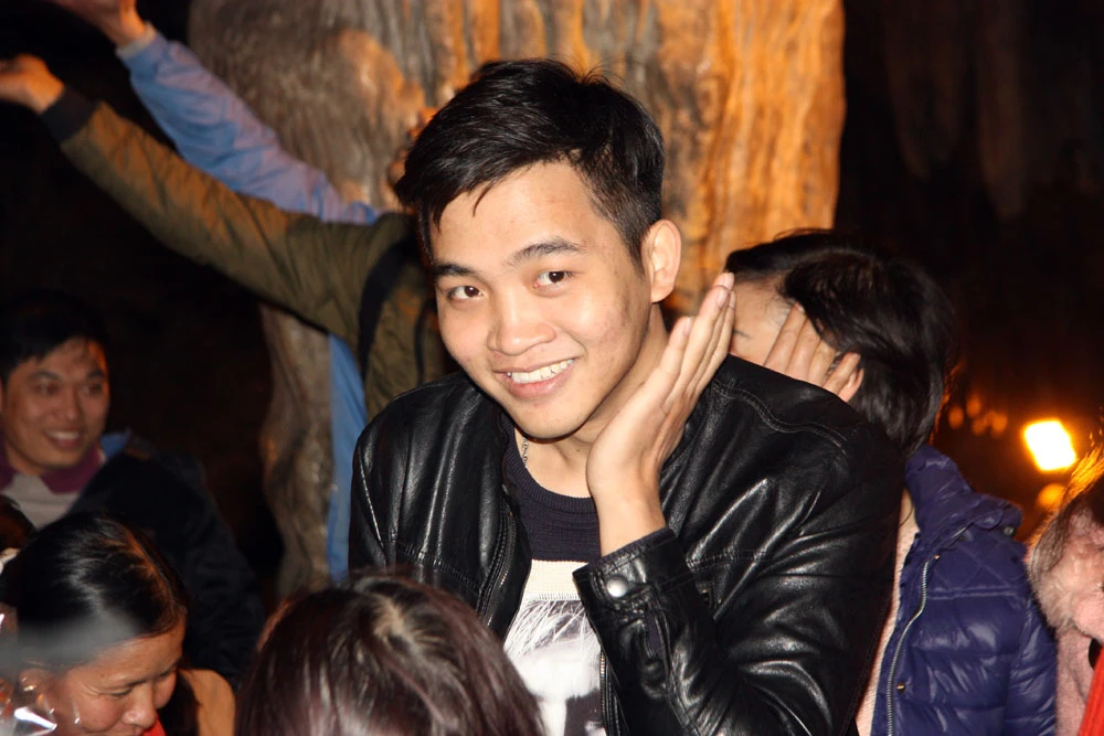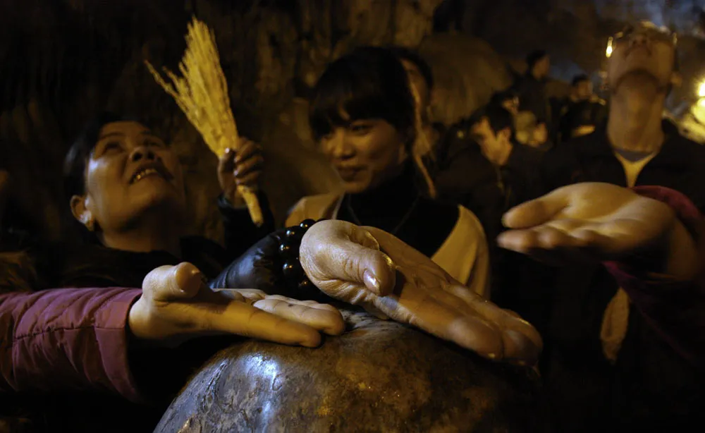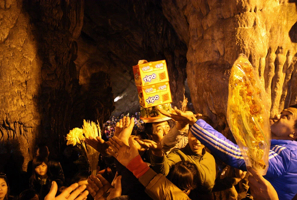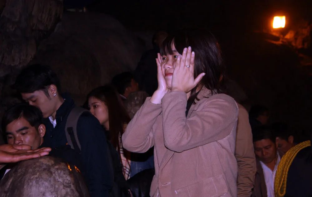 Sau khi thắp hương khấn phật xong, nhiều người đua nhau đưa ra tay hứng những giọt nước từ thạch nhũ trên cao rơi xuống.