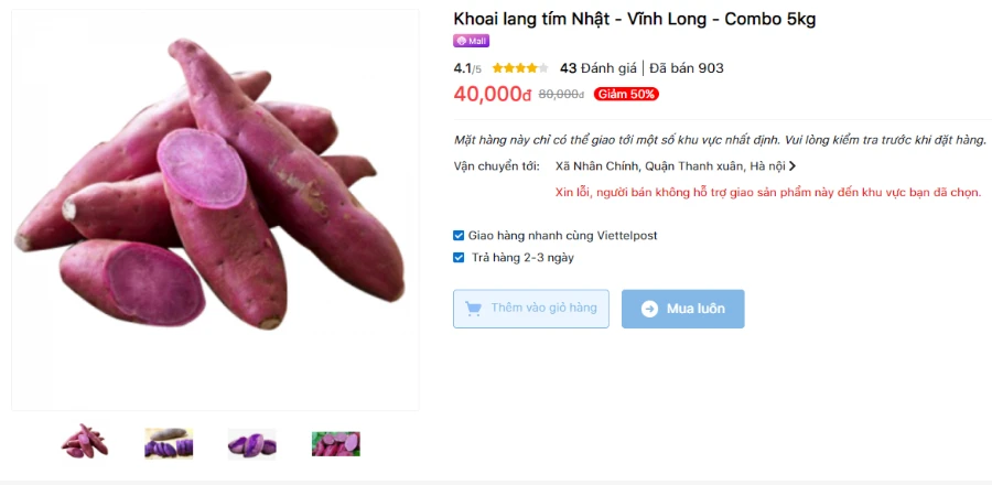Sản phẩm khoai lang tím của Vĩnh Long trên sàn thương mại điện tử Vỏ Sò.