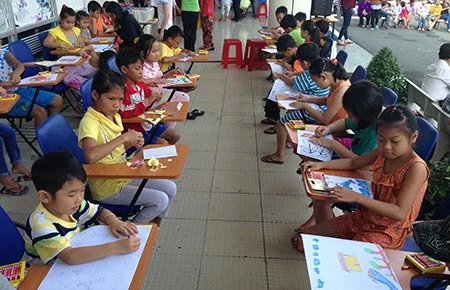 Trái với sự yên tĩnh trong thư viện, các anh chị của thư viện lưu động đồng thời triển khai chương trình vẽ tranh, tô màu hết sức sôi động ở ngoài trời. Nhiều bé khi cha mẹ vừa dừng xe đã chạy ùa đến bàn phát sáp màu, giấy... rồi tự động đi tìm cho mình một chỗ ngồi đã đặt sẵn tô tô vẽ vẽ rất chăm chú.