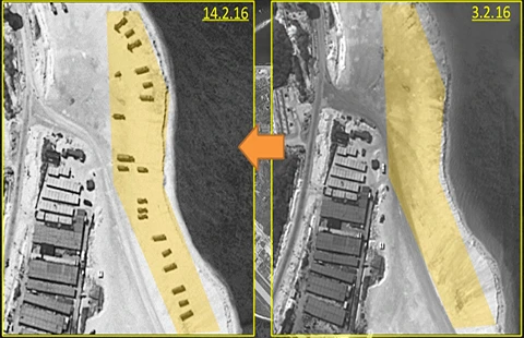 Hình ảnh bãi biển phía bắc đảo Phú Lâm vào ngày 14-2 (trái) và ngày 3-2 (phải). Ảnh: IMAGESAT INTERNATIONAL
